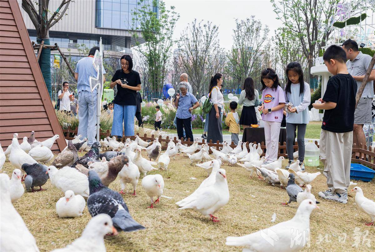 10月4日,游客在武昌滨江天街自带的“旷野公园”内投喂鸽子。
